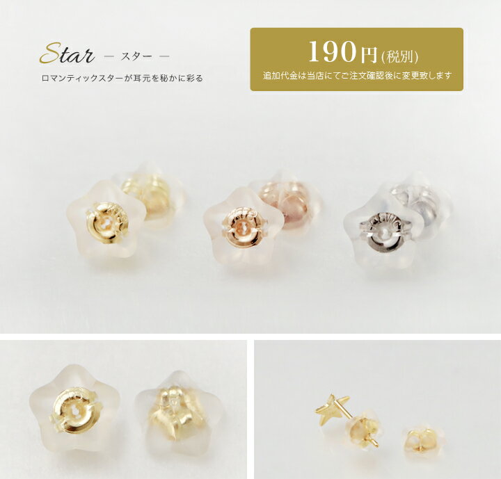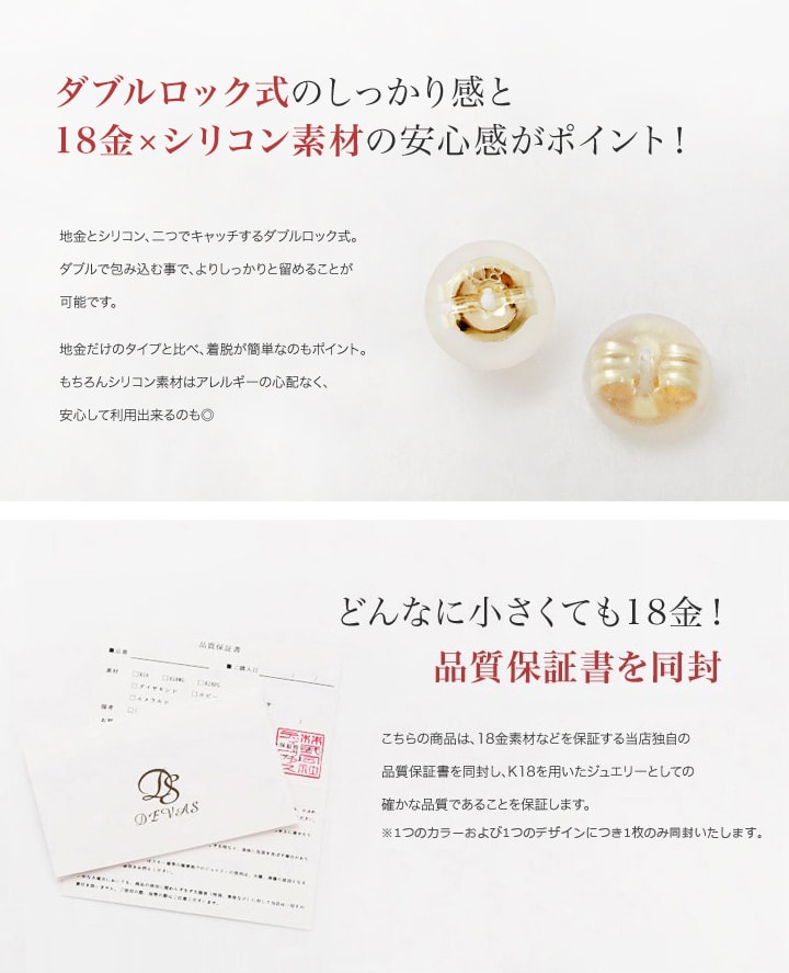 【スターデザイン】・・・ロマンティックスターが耳元を秘かに彩る 【ハートデザイン】・・・ぷっくらとしたハートが大人可愛い 【ラウンドデザイン】・・・シンプルであらゆる商品に合わせやすい Made in japan品質のピアスキャッチは、18金素材などを保証する当店独自の品質保証書を同封し、K18を用いたジュエリーとしての確かな品質であることを保証します。